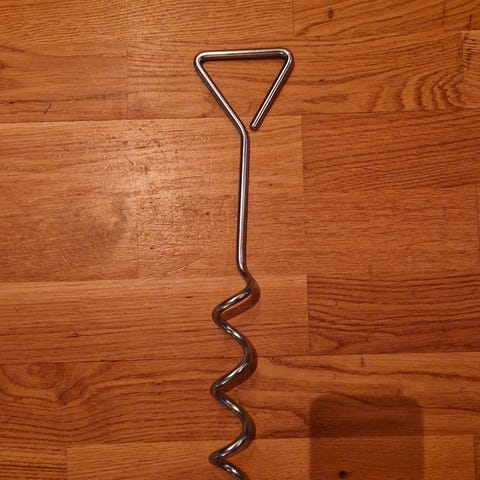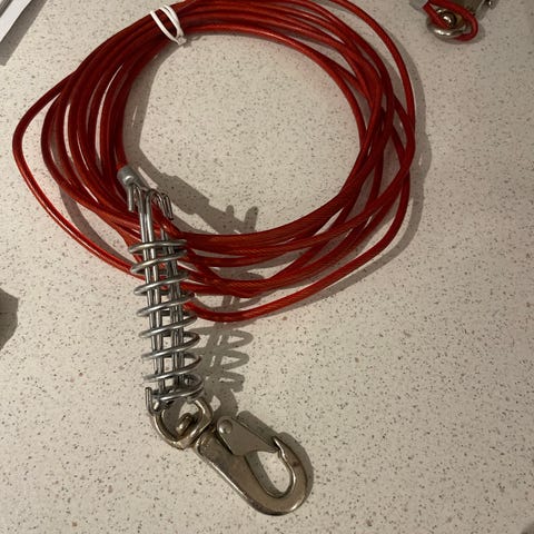 Løpestreng med jordspyd og fjær. Består av en lang vaier med krok for feste til halsbånd eller sele, samt jordspyd for forankring i bakken. Innebygget fjærdel demper rykk i linen. Egnet for midlertidig sikring av hund utendørs der det er mulig å feste jordspydet i bakken. Lengde 5 m.