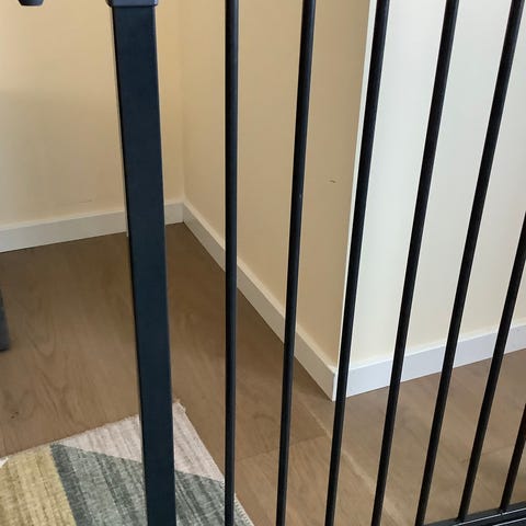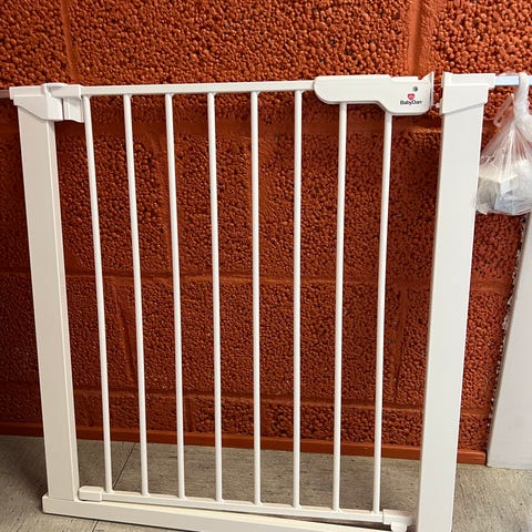 Dreambaby sikkerhetsgrind i metall i grå farge. Grind med vertikale spiler og festeanordning for montering i åpning eller døråpning.