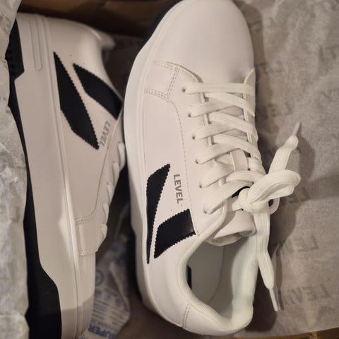 Levity sneakers/joggesko i størrelse 44. Modellen har overdel i syntetisk materiale i hvit og lys grå med snøring foran. Yttersåle i gummi med brunt mønster for grep. Nøytral og enkel stil som passer til hverdagsbruk og fritidsaktiviteter.