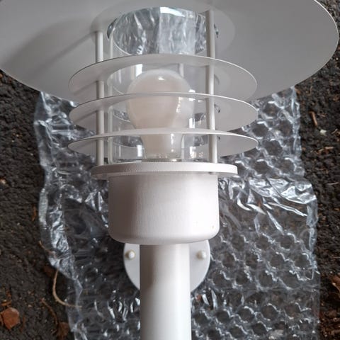 Scan Gifts XX901 utelampe for veggmontering i svart utførelse. Lampen har klassisk lyktedesign med klar glasskarm og er beregnet for bruk utendørs. Skiltet angir 230V og maks 60W pære (E27-sokkel). Egnet for montering på yttervegg, for eksempel ved inngangsparti, garasje eller terrasse.