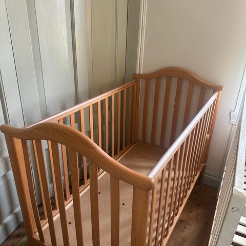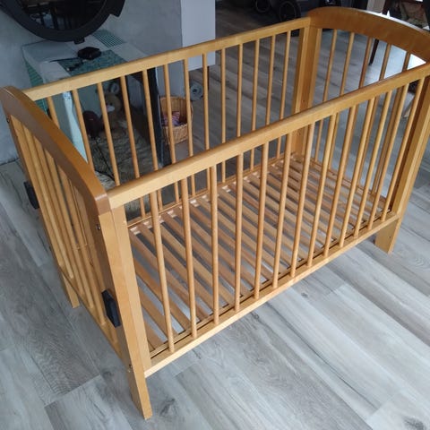 Sprinkelseng i tre. Klassisk rektangulær barneseng med sprosser på alle sider. Passer som seng til baby og småbarn på soverom eller i stue.