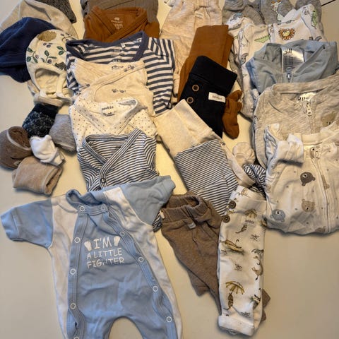 Name it, h&m og andre merker med babyklær sett i størrelse 50 for gutt/ unisex. Klærne er i ulike flerfargede varianter, og inkluderer blant annet bodyer, bukser, sparkedresser og eventuelle andre basisplagg som vises på bildene. Egnet for nyfødt/baby i størrelse 50. Klærne kan brukes til hverdags og som skiftetøy, og gir et utvalg av forskjellige plagg i samme størrelse.