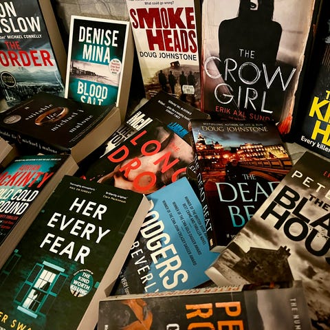 Haugevis av krim bøker til salgs. Mange av dem er signerte.
