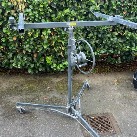Probuilder gipsheis stativ i grå metallutførelse. Heisen har hjul for enkel forflytning og sveiv for løfting og senking av plater. Egnet for montering av gipsplater og andre plateprodukter i tak og på vegg i verksted, garasje eller ved oppussingsarbeid. Justerbare armer for å holde plater stabilt under montering. Brukt til ett enkeltstående prosjekt, pent brukt.