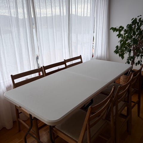 Bordene er solide og sammenleggbare. Bordplaten måler 180 cm i diameter og passer til opptil 10 personer.