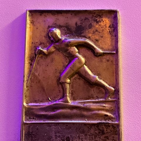 Selger to flotte, vintage suvenirskjeer med skitema og teksten «For god skisport». Motivene viser skiløpere i relieff. Perfekt for samlere av skikunst, norsk idrettshistorie eller retro suvenirer.