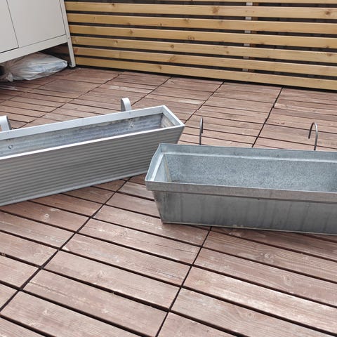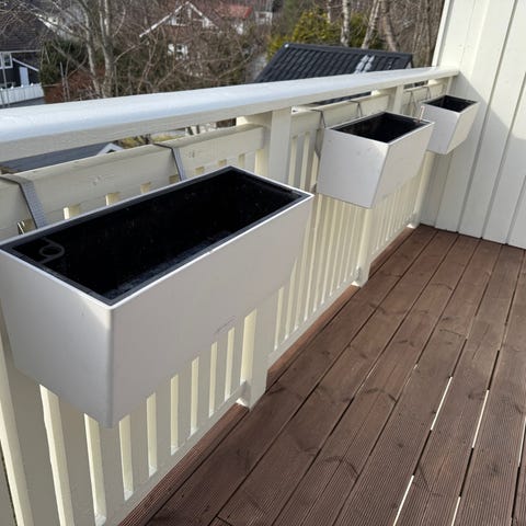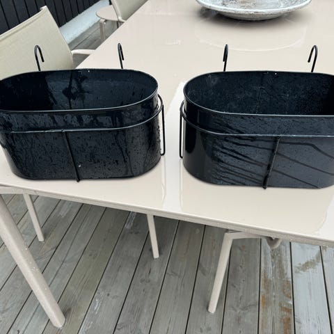 Blomsterkasser til balkong i svart farge. Kasser med oppheng som kan henges på rekkverk, egnet for planting av blomster eller urter på balkong eller terrasse. Laget i et solid materiale som tåler utendørs bruk.