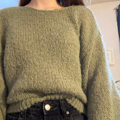 Varm og nydelig ballongermer i strikk fra den unge norske designeren Elsa Fredrikke/Ootd/Høst & Vår fra Bryne. Laget i ullblanding. Klar grønnfarge.