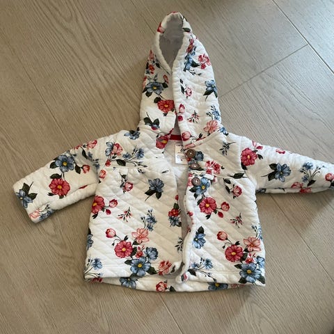 Ubrukt jakke og lue til baby. Jeg vant den på basar en gang, men ettersom jeg ikke kjenner noen barn kan noen andre få glede av settet!