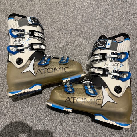 Atomic Hawx 90 W alpinstøvler i størrelse 23.0–23.5. Støvlene har hvit overskall og gjennomsiktig gullfarget underdel med blå og svarte detaljer. Modellen er en damestøvel med fire justerbare spenner og powerstrap øverst for god tilpasning rundt leggen. Skostørrelse 37-38 .Egner seg til vanlig alpinbruk i preparerte anlegg.
