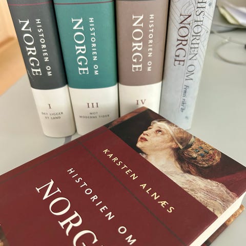 Karsten Alnæs Historien om Norge bokserie med 5 bind. Serien dekker norsk historie fra tidlig tid og frem mot moderne tid. Følgende titler inngår i settet: