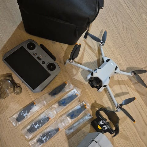 DJI Mini 3 drone. Fly moore pakke me 3 batteri og dji sin kontroll med sjerm innebygd. Kjempe drone men selges da eg ikke hadde med min egen på Skottland tur. Super drone på alle vis. Følger med 3 sett med propeller og
