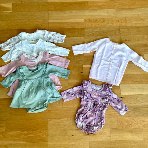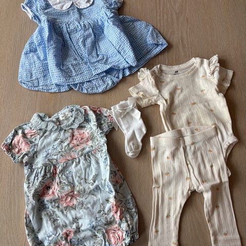 Sommerpakke med tre kortermede omslagsbodyer og en seleshorts i str 56.