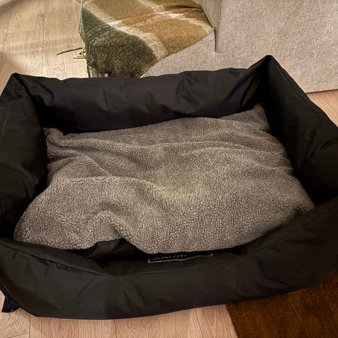 Svart hundeseng i rektangulær form fra Hunter! Sengen har myke, polstrede kanter rundt hele liggeflaten og en løs pute i midten. Passer til mellomstore til store hunder, avhengig av mål. Yttermaterialet fremstår som slitesterkt stoff som er enkelt å tørke av. Egnet som fast liggeplass i hjemmet eller på hytta. Hunden min har kun prøvd den typ 2 ganger men aldri slått seg til ro så er god som ny! Selges da den ikke brukes noe, så den bør få en ny firebeint eier🐶Bare å sende melding om du er interessert eller lurer på noe, pris kan diskuteres🤗Ny pris: 1900kr