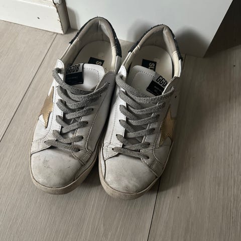 Pent brukte Golden goose super-star sko i str 39 (normsl i str). Hvite med sorte og rosa detaljer. Selges da de ikke brukes lenger. De er ekte.