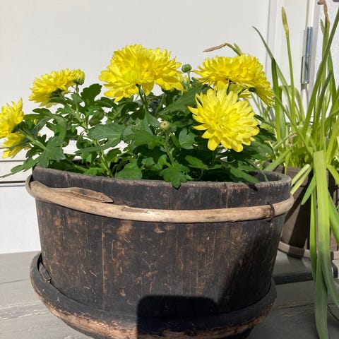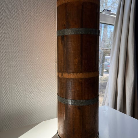 Bøtten er laget av trestaver med 2 metallbånd og 1 trebånd rundt for å holde konstruksjonen sammen. Båndene er litt løse. Det ene håndtaket er litt ødelagt samt at en trestav mangler en bit, se bilder.