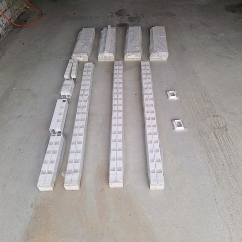 Bewi Thermomur 350 isoporelement for grunnmur eller ringmur. 10 cm isolasjon på hver side, 15cm plass til betong. Alle er vanlig standardblokk. Har totalt 13 stk, 11 stk i bra stand, pluss 2 stk med defekter.
