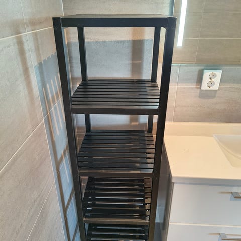 Röshults håndklehylle i svart metall. Hyllen har flere åpne rom for lagring og organisering av håndklær. Passer til bruk på bad, spa eller garderobe der det er behov for praktisk oppbevaring av håndklær eller tekstiler. Frittstående konstruksjon som kan plasseres inntil vegg eller i et hjørne, avhengig av romløsning.