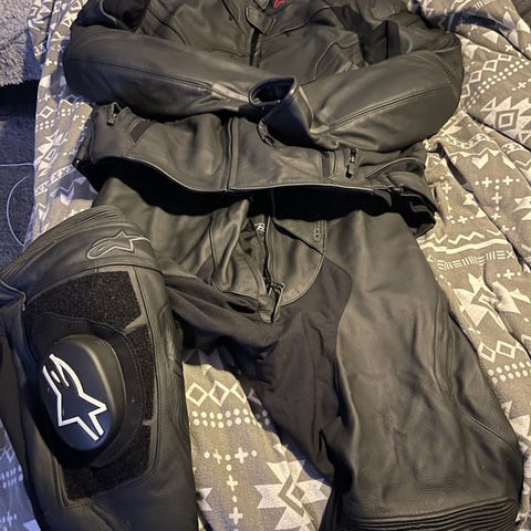 Alpinestars motorsykkelutstyr sett i skinn. Settet består av todelt skinndress med jakke og bukse i svart med hvite detaljer, samt matchende hansker og støvler. Jakke og bukse har integrerte beskyttelsespaneler og stretchfelt for bevegelighet.