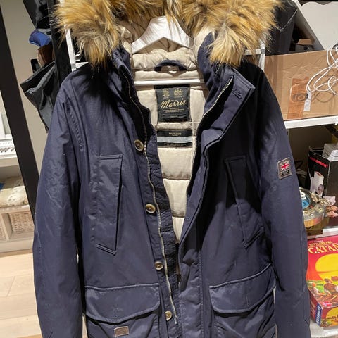 Jean Paul vinterjakke til herre i størrelse 52. Jakken er blå og fylt med dun for god isolasjon. Den har hette med pelskant, flere utvendige og innvendige lommer samt justeringsmuligheter i livet og nederst. Egnet som varm ytterjakke i vinterhalvåret.