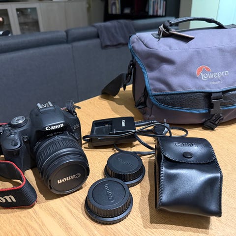 Følger ikke med lader, men inneholder kamerabatteri. Fungerte tipp topp da jeg brukte det sist i 2022, men har siden mistet laderen til kameraet dessverre.