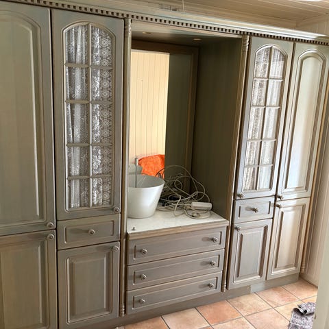 (Reservert) Hyller, speil, gardinstang, rullegardin, tørkestativ gies bort