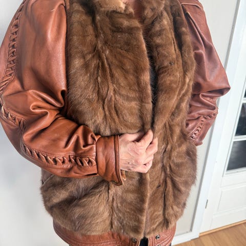 Vintage jakke med ekte pels. Det er lamme skin og ulve pels. Vintage fra 70/80 tallet. Pent brukt, ingen skader. Dideri skin jakke. Størrelse L