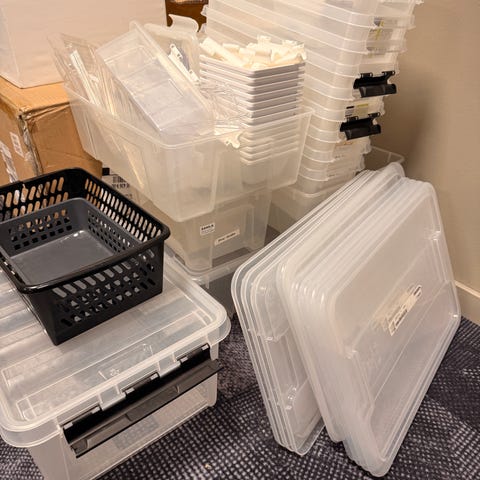 Plastkasser / oppbevaringsbokser i rød og blå farge.