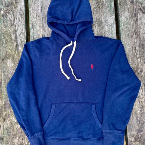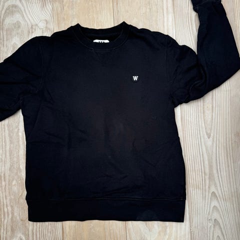 Wood Wood Double A hettegenser for herre i størrelse S. Genseren er mørkeblå og laget av 100% økologisk bomull. Modellen har hette med snøring, kengurulomme foran og lite rundt logoemblem på brystet. Passer til hverdagsbruk og som et lag over t-skjorte eller under jakke.