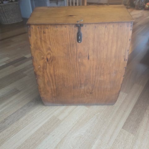 Trekasse utformet som ryggsekk med bærestropper i lær. Kassen er malt i en lys blå farge og har lokk med metallbeslag og lukking. Innvendig er den ubehandlet treverk. Kan brukes til oppbevaring eller som dekorativ gjenstand. Egner seg også som spesiell bære- eller transportløsning der man ønsker en stiv og robust kasse på ryggen.