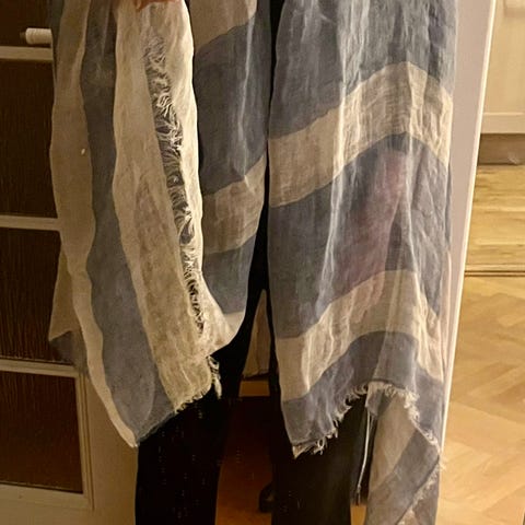Jeg selger et lekkert silke sjal i hvit med lyseblå striper i merket Frangi Tie Rack. Egnet til festantrekk, men også til annet bruk.