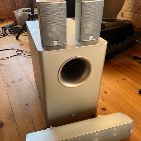 Subwooferen leverer dyp og kraftig bass, mens de små høyttalerne gir klar og tydelig lyd. Passer fint i stue.