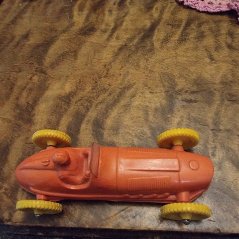 Eldre/ vintage plast racerbil. Bruksslitasje, men mye bil igjen😊