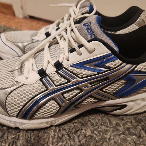 joggesko i størrelse 44. Skoene er i svart med de karakteristiske tre stripene på siden i kontrastfarge. Overdelen ser ut til å være i pustende tekstil/mesh med snøring foran. Sålen er lys og relativt flat, egnet til hverdagsbruk og lett trening. Passer for voksen person med skostørrelse 44.