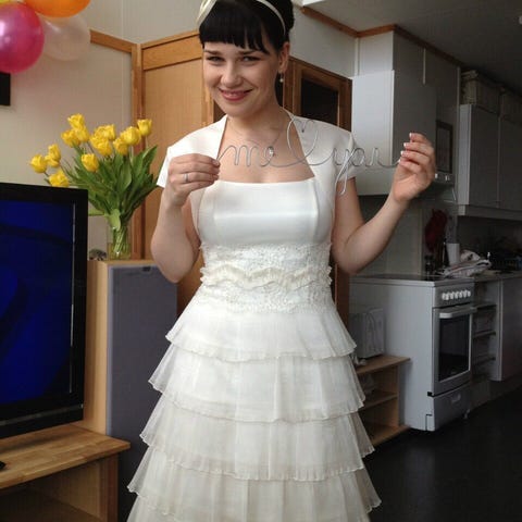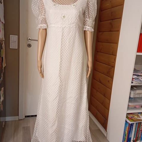 Nydelig brudekjole i en dyp kremfarge med vakre detaljer i slep og i liv. Denne sitter som en drøm på kroppen, og gir en nostalgisk følelse rundt kantene.
