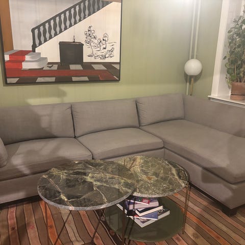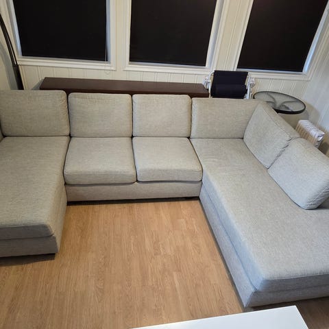 En høykvalitet springfjær-sofa i grått ullstoff. Blir en veldig flott sofa hvis du trekker den om. Alternativt er å bruke som er i fks. et kollektiv.
