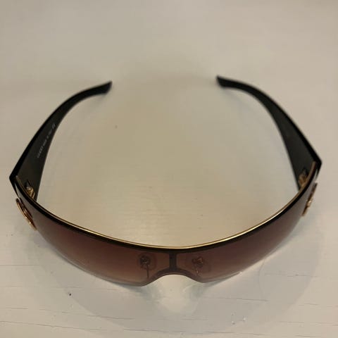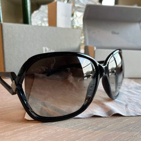 Dior solbriller for dame i brun tone. Modellen har store, buede glass som gir godt dekke rundt øynene. Innfatningen er i mørk brun plast med karakteristiske Dior-detaljer i metall på sidene. Passer som hverdags- og fritidsbrille i sollys.