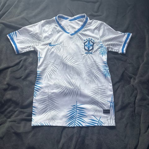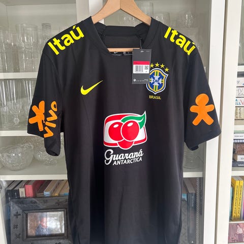 Helt ny Brasil Neymar Jr fotballdrakt for herre i størrelse L. Drakten er svart med gule detaljer, inkludert nummer 10 foran og bak samt Brasil-logo på brystet. Kortermet modell med rund hals og mønsterdetaljer på ermer og krage. Egnet til bruk ved fotballspill, trening eller som supporterplagg.