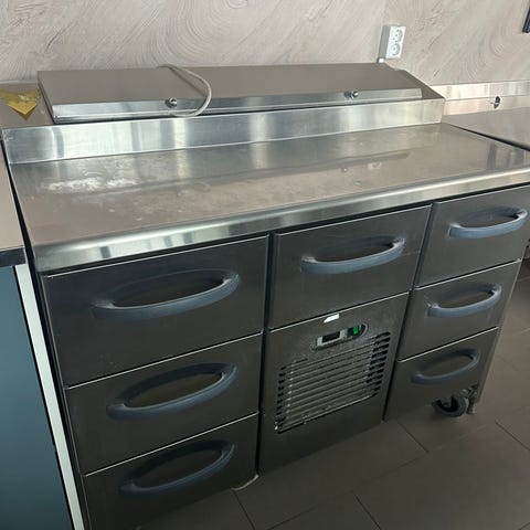 Selger solid og romslig kjølebenk i rustfritt stål, perfekt for restaurant, kantine, gatekjøkken eller catering. Praktisk løsning med god lagringsplass og kjøling i samme enhet.