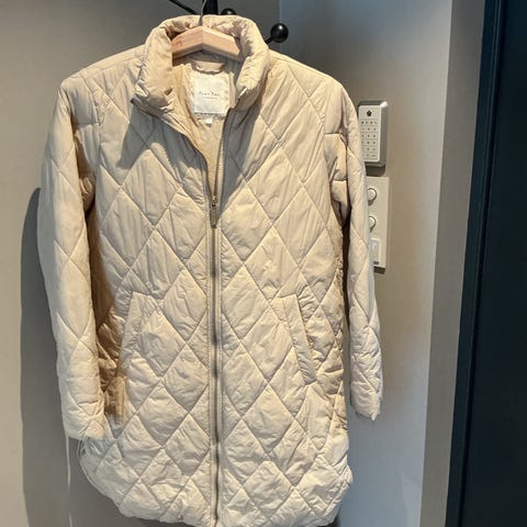Part Two quiltet jakke for dame i størrelse 36. Den har et langt, rett snitt med diamantquiltet mønster, rund hals og knepping foran. Store påsydde lommer foran og splitt i sidene gir bevegelsesfrihet. Egnet som lett ytterjakke i overgangssesonger.Hel lengde 106cm