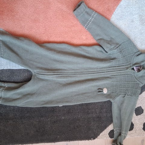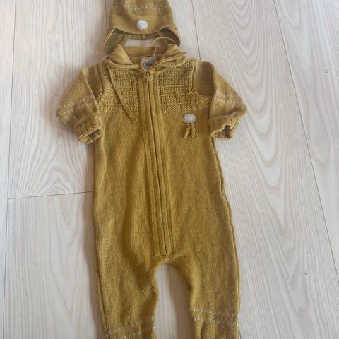 Lillelam ulldress til barn i størrelse 98. Dressen er i brun ull og passer til både jente og gutt (unisex). Hel glidelås foran og ribb ved ermer og ben. Medfølgende lue og votter i samme farge og materiale. Strikket strukturmønster på overdel og votter, samt detaljer på ermer og lue. Egnet som ytterplagg eller mellomlag på kjølige dager.