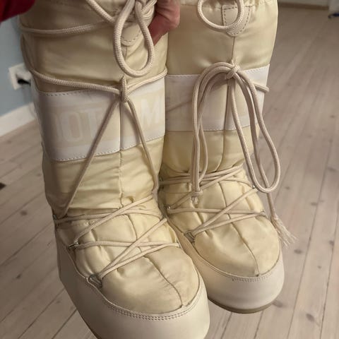 Moon Boot vinterstøvler i størrelse 39-41 i kremhvit farge. Klassisk høy modell med snøring foran og rundt skaftet for justering av passform. Mykt, vattert skaft og innside som gir isolasjon mot kulde. Yttersåle i gummi med mønster for bedre grep på snø og glatt underlag. Egnet som varme vinter- og snøstøvler til fritidsbruk og opphold i kaldt vær. Brukt en gang på vinterferie i februar. Ble for store for meg.