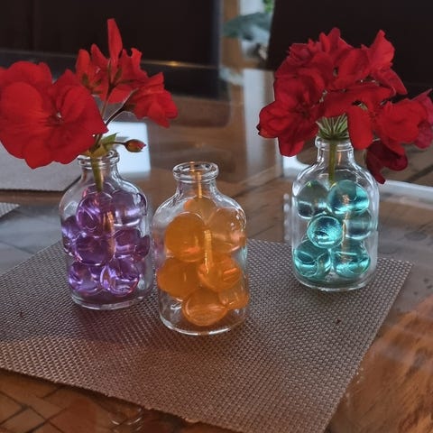 Pakke med diverse umerkede dekorasjonsartikler. Inneholder ulike typer kunstige blomster, små dekorasjonskuler og annen pynt i hovedsak i røde, hvite og lyse farger. Produktene leveres i separate poser og esker, egnet til bruk i borddekorasjoner, gaveinnpakning, hobbyprosjekter eller annen kreativ dekor. Flere deler ser ut til å være ubrukte og ligger i originalemballasje.