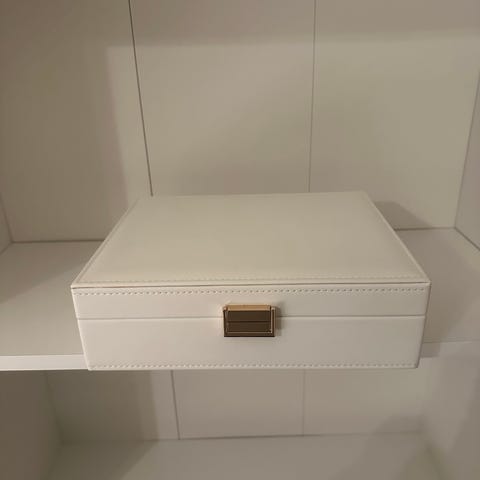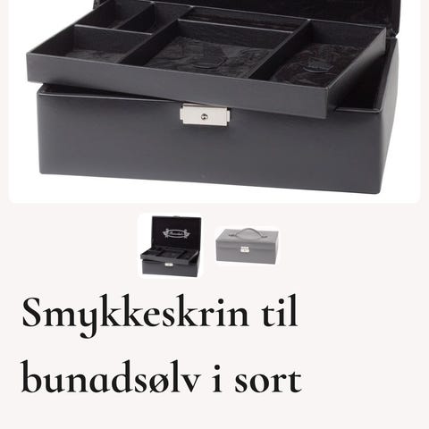 Glitter smykkeskrin i svart farge. Skrinet har rektangulær form med lokk, bærehåndtak og metallfarget lås. Innvendig har det flere inndelte rom i lys innredning for oppbevaring av ulike typer smykker, som ringer, armbånd, halskjeder og ørepynt. Lokket har speil og en lomme/strikkfelt på innsiden for ekstra oppbevaring. Egnet til organisering og oppbevaring av smykker hjemme eller på reise. Er noen få bruksmerker.