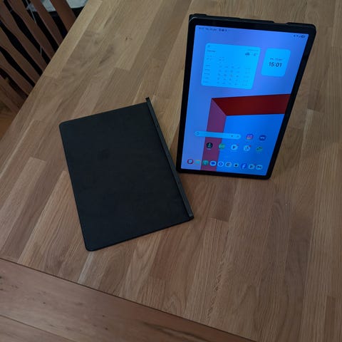Nettbrett fra Samsung med tastatur. Er en ripe i glasset som vises når skjermen er av (se bilde).