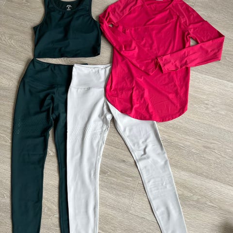 Kari Traa Butterfly svart langermet er str XL passer fint til str M, blå knebukse er str. M/M Rosa genser er fra McKinley str40 95% polyamide 5% elastene. Syntetisk, pustende, Passer til f.eks. løping, trening osv. Aldri brukt.