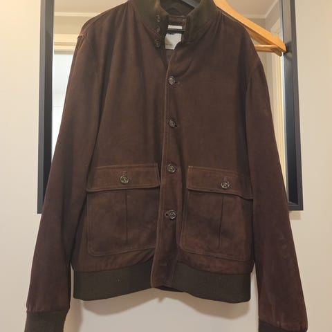 Jakken er laget i skinn med ribbestrikket kant nederst og ved ermer. Den har knappelukking foran og to store frontlommer med klaff og knapp.