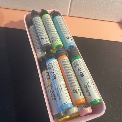 Settet inneholder også plasthansker, bomullspinner og en sjablong med blomstermotiv.