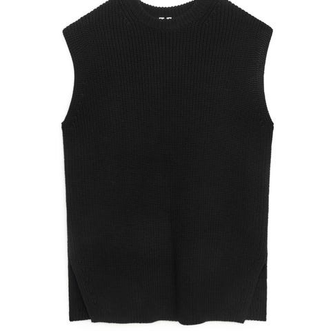 Arket lang damevest i beige lin i størrelse S. Vesten er ermeløs med dyp v-utringning og knepping foran. Den har to klaffelommer i front og er helfôret på innsiden. Passer til bruk over skjorter, topper eller kjoler, både til hverdags og mer formelle anledninger.