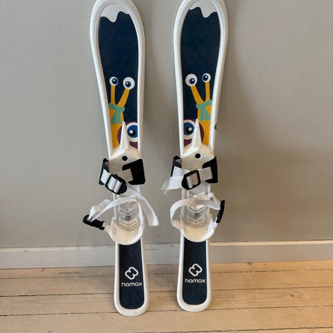Hamax barneski med staver. Korte ski med integrerte reimer for feste over vanlige vintersko. Undersiden har mønster for bedre feste på snø. Medfølgende staver i matchende lengde med plasttallerkener og håndtak tilpasset barn. Egnet til lek og enkel skigåing for mindre barn i bakke eller på flatmark.